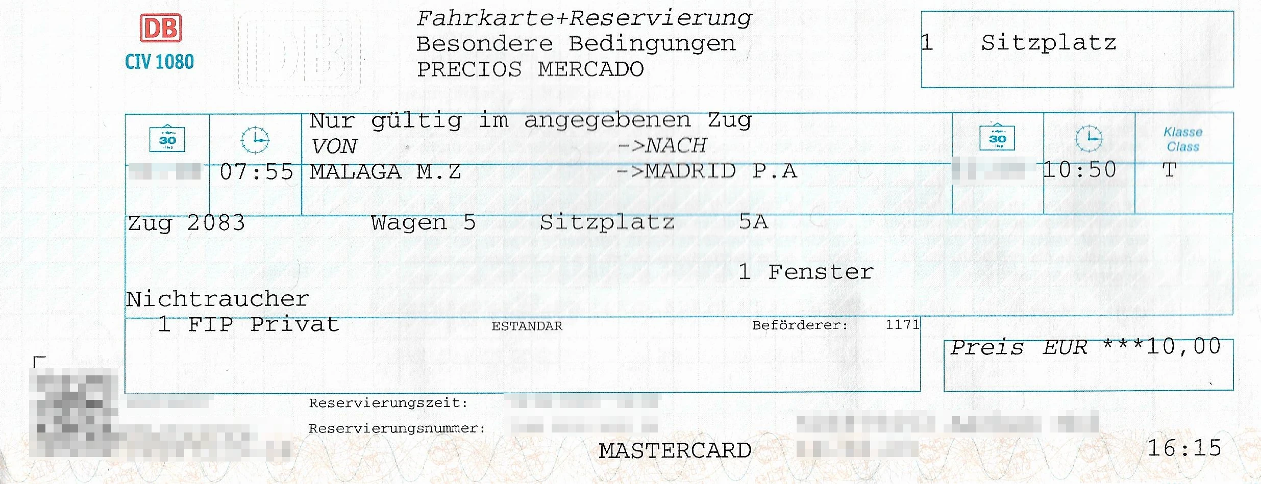 Tickets for trains requiring reservations can be sold at DB Travel Centers. Please ensure that either “T” (for Elige Estándar / Turista) or “P” (for Elige Confort) is specified as the class. If 1st class or 2nd class is selected as the class, tickets will not be issued with an error message. A booking of Premium class tickets is not possible through Deutsche Bahn’s sales channels. It has also been reported that the booking of class “P” sometimes fails, in which case a booking of class “T” often works. There is no booking fee.