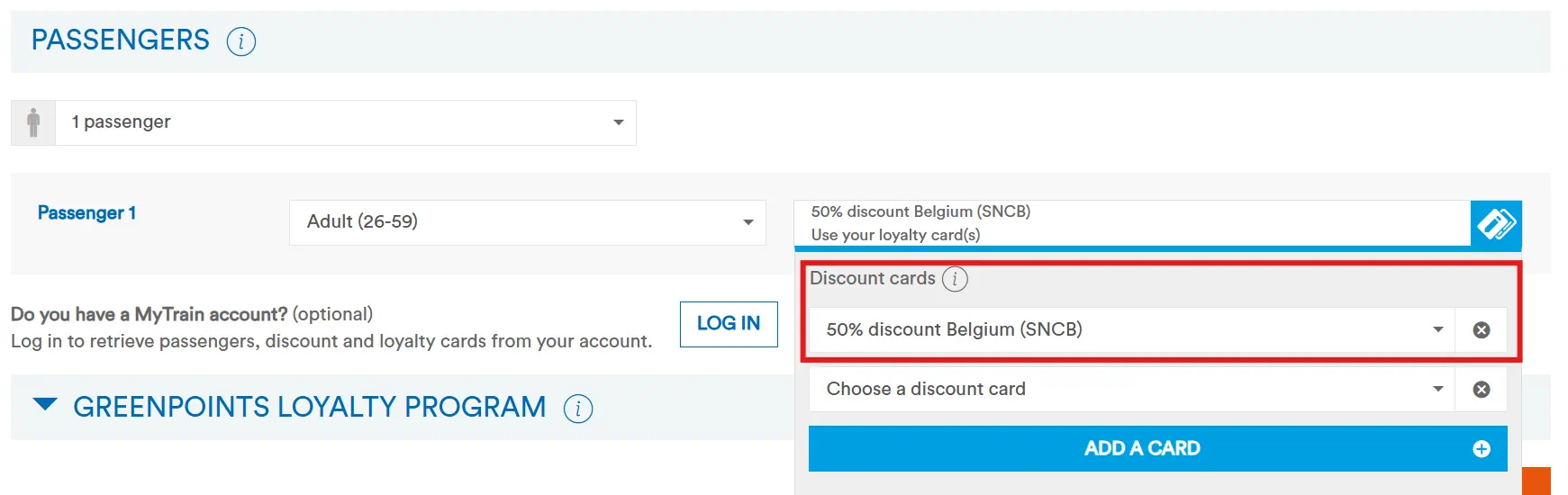 The SNCB sells tickets online with a FIP 50 discount for cross-border connections to Belgium’s neighbouring countries. Simply select the discount “50% Discount Belgium (SNCB)” for the travelers. Multiple discounts can also be specified here, e.g., a simultaneously valid FIP Coupons for CFL (Luxembourg) or NS (Netherlands).